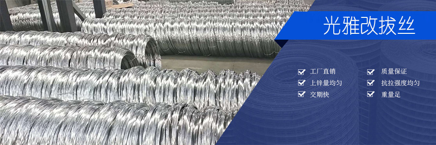 改拔絲由熱鍍鋅或者電鍍鋅鐵絲改拔而成,表面光滑,明亮,它的抗拉強(qiáng)度變得更強(qiáng),并且不易斷裂。